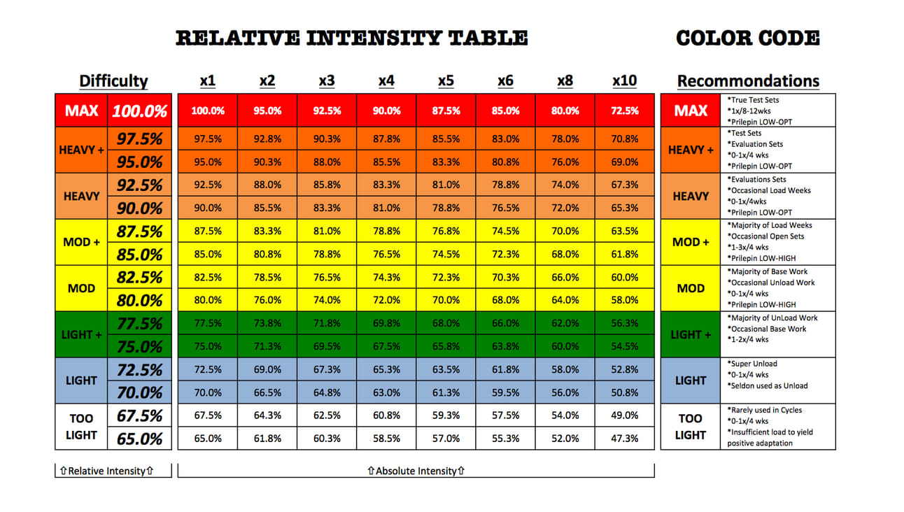 Relative intensity: the difficulty of a set of movements. For example, Session 14’s prescribed workout is 3×3 at 95%. Doing 95% 3 times has the relative intensity of 105%, meaning it’ll feel 5% harder than a 1RM.
