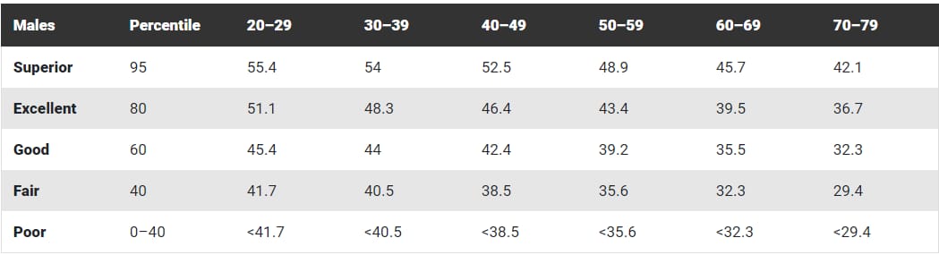 A VO2 Max of 35 is…not that high. By most charts, it would be considered “poor” for anyone younger than 50.