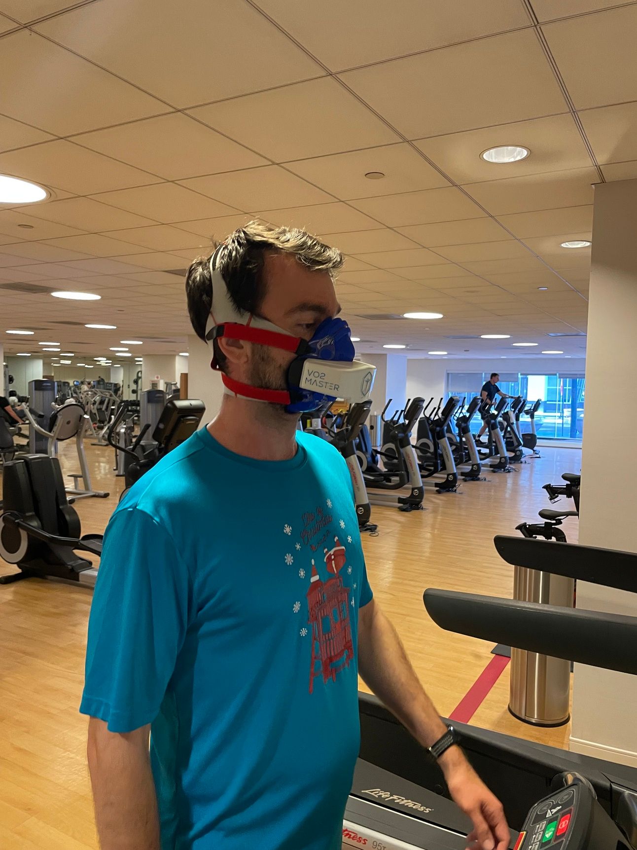 I get his profile set up, fit him for the mask, and walk him through the testing protocol. We’re doing a Graded Exercise Test that starts him walking on the treadmill at a 2% incline at 2mph and then we increase 0.5mph every minute until he hops off. I show him the screen with his numbers, we agree that all we’re going for is a VO2 Max above 35, and we start the test.