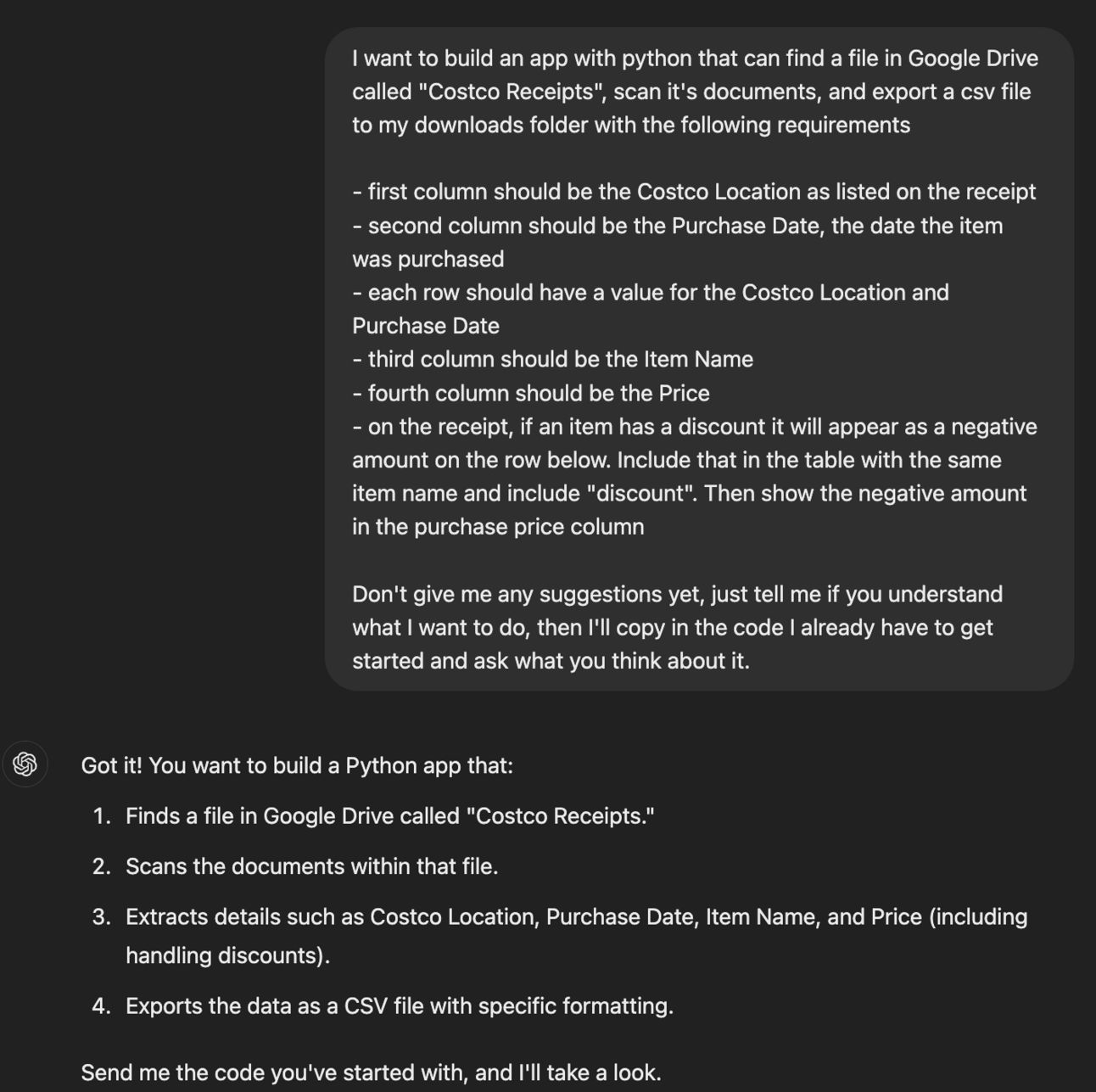 I used ChatGPT to build an app that reads and itemizes all my Costco receipts this year and summarizes the data into an Excel spreadsheet.