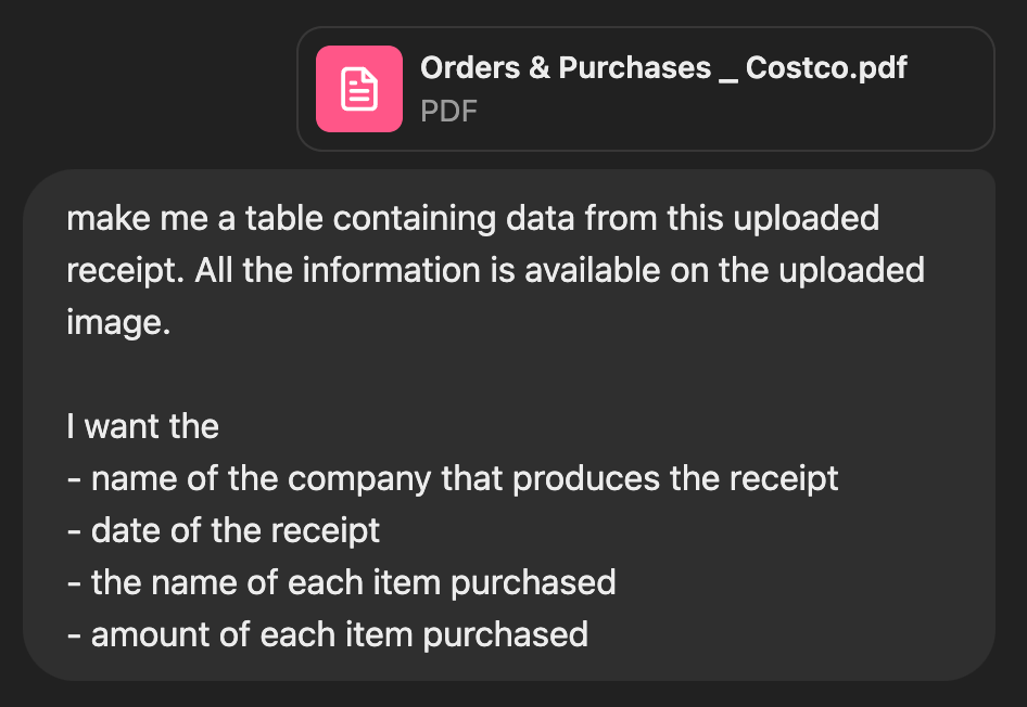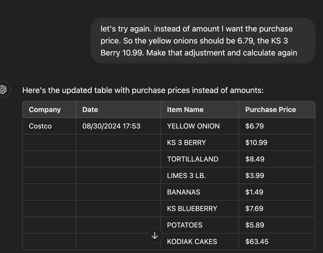 For whatever reason, I decided to upload a file to ChatGPT and ask it to make me a table with the item, the price, and the amount.